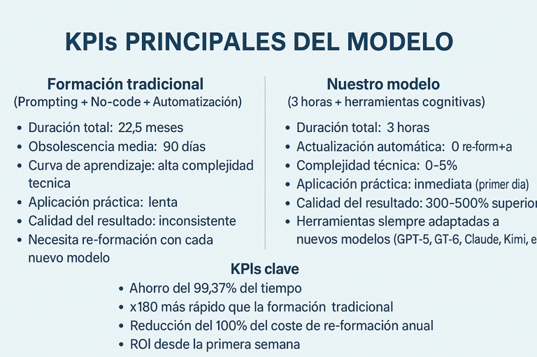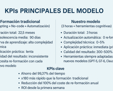 Un programa intensivo de tres horas que permite a directivos y equipos clave dominar prompting, automatización y creación no-code sin curva técnica. La metodología 3–3–3 reduce más de 22 meses de aprendizaje tradicional a un modelo práctico, claro y orientado a resultados reales desde el primer día